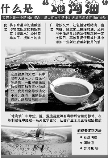 曾在北京多家大酒樓擔任總廚、高管的特級廚師馮鵬說,一般情況下,地溝油和普通油無法區分,進貨時難免上當。他只能通過實踐來判斷:飯館炒菜之前一般要先過油,在這道“滑油”工序中,好油可反復使用七八次,而地溝油最多使用三次就會變黏,而且有哈喇味兒。